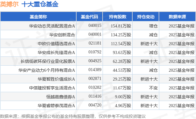 根据2025基金年报公募基金重仓股数据,重仓该股的公募基金共18家,其中持有数量最多的公募基金为华安基金的华安动态灵活配置混合A。华安动态灵活配置混合A目前规模为8.38亿元,最新净值4.713(4月8日),较上一交易日上涨4.22%,近一年上涨45.73%。该公募基金现任基金经理为熊哲颖。熊哲颖在任的基金产品包括:华安新能源主题混合A,管理时间为2023年7月17日至今,期间收益率为46.53%;华安先进制造混合发起式A,管理时间为2025年1月21日至今,期间收益率为3.41%;华安低碳生活混合A,管理时间为2025年5月6日至今,期间收益率为41.32%;